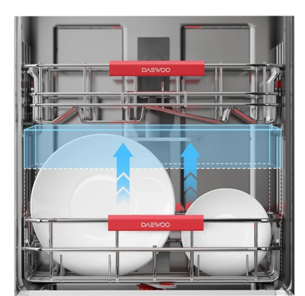سیستم شستشو: ظرفشویی دوو دارای 2 سبد شستشو به علاوه سبد ویژه ی قاشق و چنگال و 2 بازوی آبپاش از پایین میباشد.